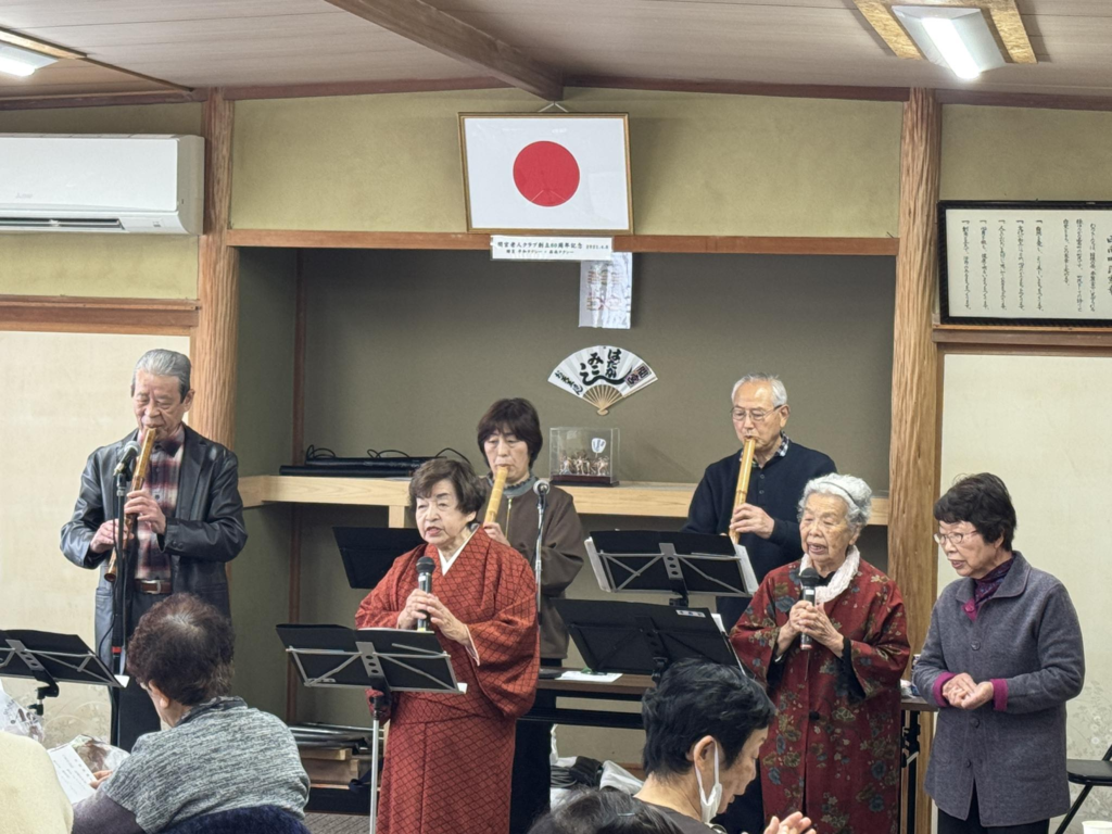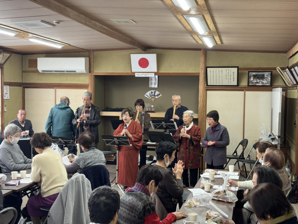会の最後には尺八と民謡が披露され、仲間と顔を合わせ、笑顔で語り合う姿がとても印象的でした。90歳を超える方も多く参加されており、こうした集いが皆さんの元気の源になっていることを実感しました。