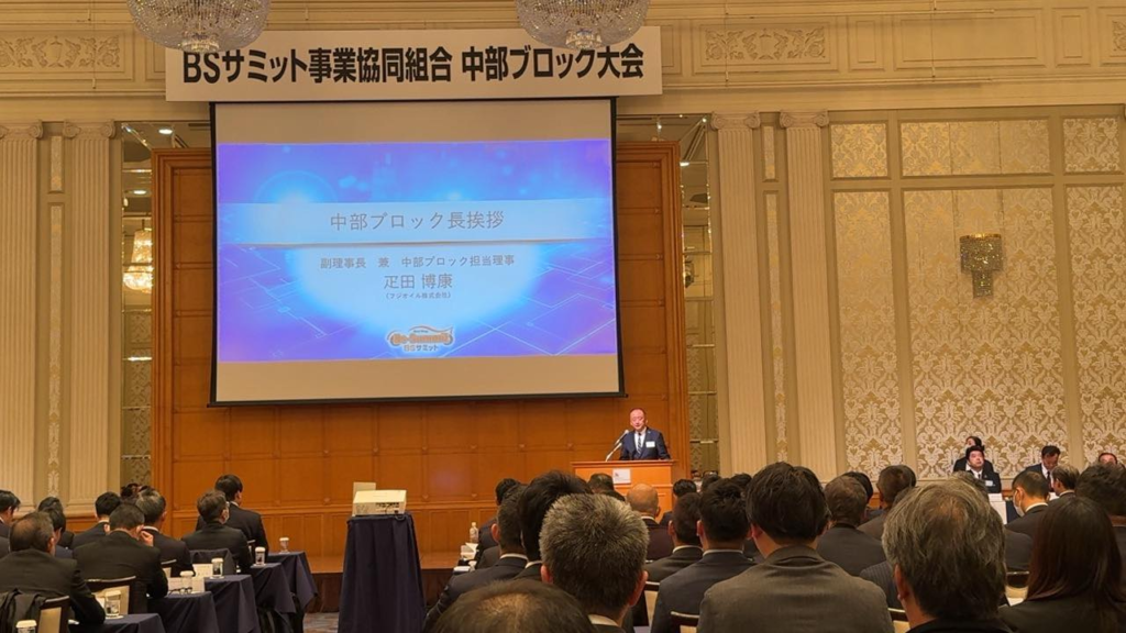 この日は、久しぶりに自営している自動車関係の仕事として「BSサミット事業協同組合 中部ブロック大会」に参加しました。会場は名古屋マリオットアソシアホテル。損害保険会社各社、ロードサービス・アシスタンス会社、自動車メーカー、自動車ディーラー、協賛・協力企業、そして組合員の代表者に加え、来賓として国会議員の皆さまも出席され、約300名が集まる大規模な大会でした。