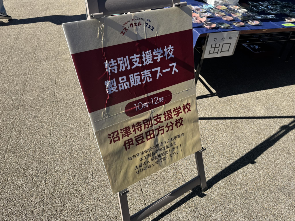 イベント広場では、沼津特別支援学校伊豆田方分校の皆さんが木工・陶芸製品を、伊豆の国特別支援学校の皆さんが紙工・木工・縫製製品を販売していました。