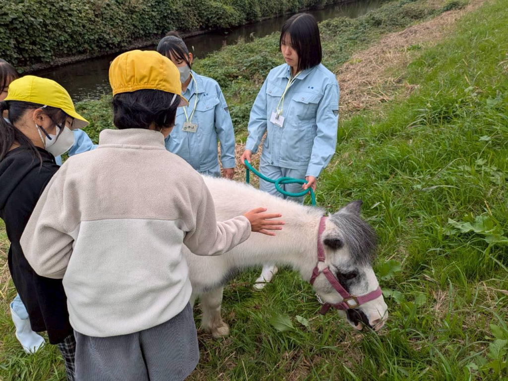 当日は、堤防で刈り取った草を動物のエサに活用する「循環型の環境整備」の実証も行われ、児童たちは、ヤギや馬、羊たちが草を食べる様子を観察したり、リモコン草刈り機をコントローラーで実際に動かす体験をしたりと、笑顔いっぱいに学んでいたそうです。