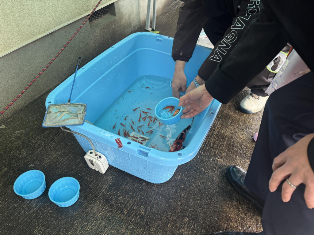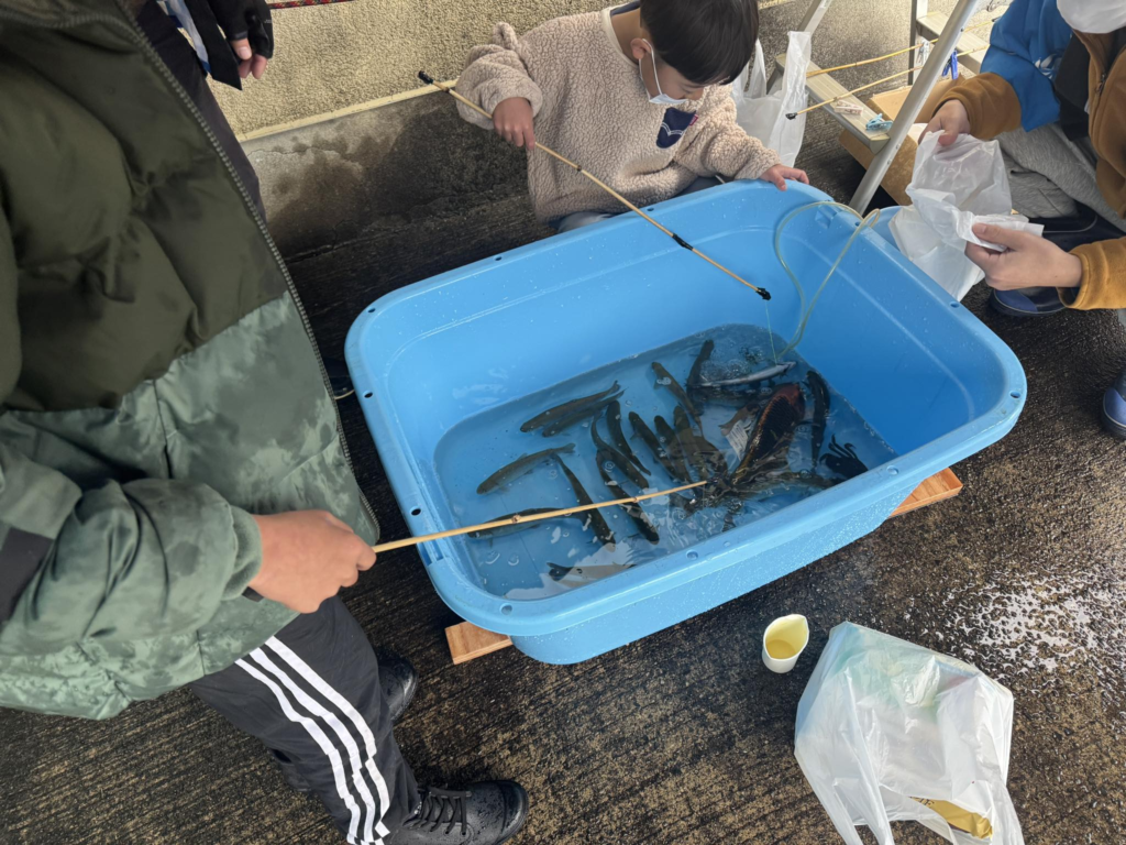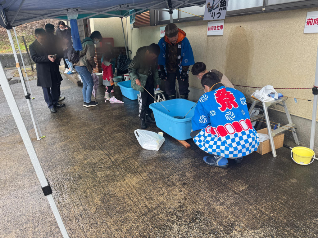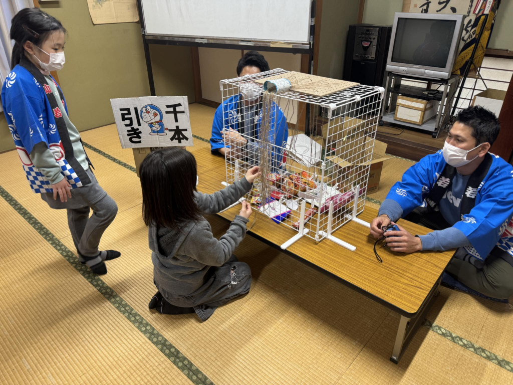 あいにくの雨のため、会場は境内ではなく大竹公民館での開催となりましたが、千本引き・らくがきせんべい・射的・魚釣り・金魚すくいなど、工夫を凝らした内容で、会場は子どもたちの笑顔に包まれていました。